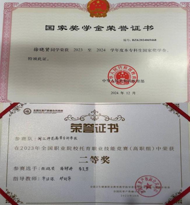 徐晓贤在学习和工作中都严格要求自己,努力成为全面发展的优秀人才。学业上,她刻苦钻研 ,毫不懈怠,成绩稳居年级榜首,连续三年蝉联校一等奖学金,2023-2024年学年更以优异表现荣获国家奖学金。在专业能力上追求卓越,斩获第一届全国职业院校托育技能竞赛(高职组)二等奖、考取家庭教育指导师,高级育婴师,教师资格证等核心证书。凭借突出表现,连续获评“优秀学生干部”、“三好学生”、“优秀共青团员”荣誉称号,此外还获“优秀实习生”、“最美职教生”奖项,是名副其实的学业标杆。