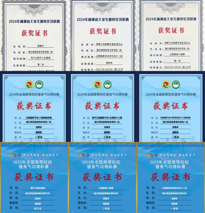 2023年8月全国健身气功锦标赛集体导引养生功十二法一等奖、全国健身气功锦标赛集体八段锦二等奖