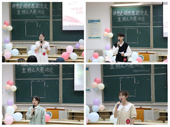 经过初赛的比拼,共有10名选手进入决赛。决赛由黄倩倩老师、李龙娇老师、团委学生干部以及各班代表担任评委。本次决赛分为个人模拟和组合模拟两个环节。在个人模拟中,选手们模拟党史活动主持的场景,通过讲述和解读各类党史故事表达了对党的崇敬之情。在组合情景模拟中,选手们两两搭档,根据抽取的题目现场模拟大型活动的主持,选手们慷慨激昂、神采飞扬,你一言、我一语热情地讴歌着伟大的中国共产党,赞颂着中国共产党成立100年来的光辉历程。现场评审团仿佛身临其境,不时地为选手们送去阵阵热烈的掌声。