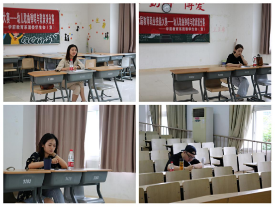 本次比赛包括两个环节,分别是幼儿歌曲弹唱和歌表演。比赛开始前,参赛选手们抽取要展示的曲目。在幼儿歌曲弹唱环节,参赛选手们到达指定教室后,根据抽取的曲目进行弹唱。弹唱过程中,大家认真、专心地投入到歌曲的演奏中,教室里不时传来一首首动听的儿童歌曲。在歌表演环节,选手们用生动活泼的肢体语言表达了对歌曲的理解,充分展示了学前学子的活泼形象,现场竞赛氛围十分浓烈。