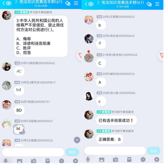 此次知识竞赛共设有必答题和抢答题两种题型。主要围绕宪法的基本常识、涉及宪法的案例、贴合生活的法律知识等方面进行设问。在第一轮中,选手们登录线上答题平台进行20分钟的必答题作答,作答结束后,工作人员进行收集和整理,随即进入第二轮比赛。在第二轮中,工作人员依次在活动群中发布抢答题,选手们收到题目后进行抢答,大家争分夺秒、积极作答,氛围紧张激烈。经过25道抢答题后,选手们胜负已分,至此本次宪法知识竞赛圆满结束。