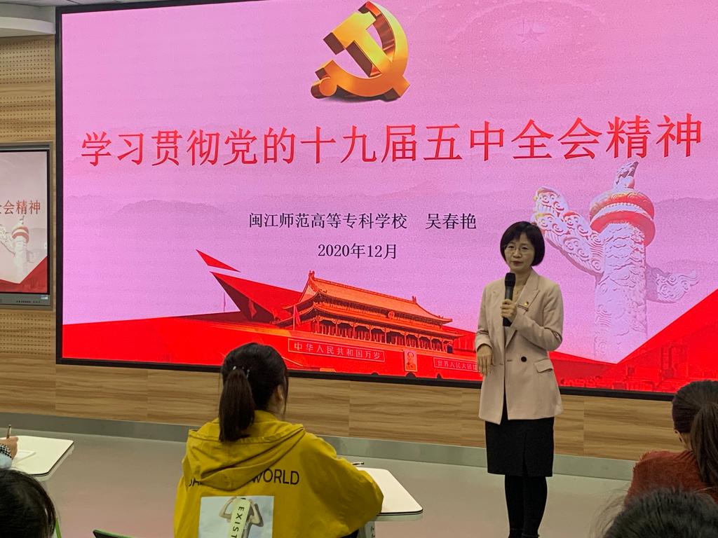 12月3日下午,福州幼教集团党总支书记吴春艳在教学楼2016教室,为集团教职工作十九届五中全会精神宣讲报告。集团直属四个幼儿园的教职工参加了本次会议。