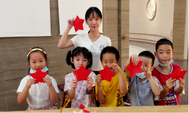 制作手工品,传递爱国情。小朋友们在志愿者的帮助下学习手工折纸,他们制作纸飞机表达对航天飞船的向往、制作红星来表达对祖国的爱、制作红船来表达对党的美好祝愿,通过手工制作,孩子们不仅提高了手工制作的动手能力,也进一步激发了他们的爱国热情。