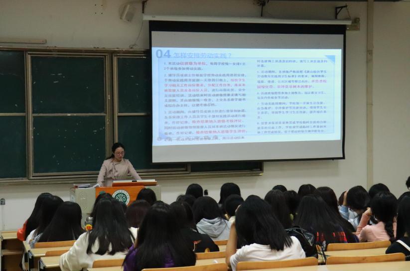精心组织,宣传动员。劳动周开始前,我系学工领导组织20级全体辅导员一起认真学习《中共中央国务院关于全面加强新时代大中小学劳动教育的意见》以及习近平总书记关于劳动教育的系列指示精神。同时,根据学校劳动教育实践周方案,共同商讨制定了符合本系特点的劳动实践周工作计划和考核标准。10月31日,李龙娇老师作为劳动教育第一周负责老师,率先在教学楼3018教室开展劳动实践周动员大会,组织学生观看习近平总书记在全国劳动模范和先进工作者表彰大会上的讲话视频,学习劳模的先进事迹,宣传“劳动教育”的重要意义,并开展岗前安全及技能培训,包括劳动时间、岗位安排、卫生标准以及考核细则等方面进行了详细的说明,鼓励全体同学在劳动中有所学、有所得。