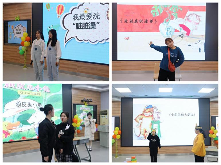 经过初赛的激烈角逐,共有12支优秀参赛队伍脱颖而出进入决赛。绘本剧表演是学前系学生学习中重要的实践课程,将故事与表演巧妙地融合在一起,具有趣味性、创造性和游戏性。同学们通过童趣的表演方式,将精彩的绘本故事生动地呈现,将绘本故事内容理解后,通过重现和再造,向观众们呈现故事的内容,表达故事的寓意。“放屁中成长的波弟”,让观众们尽情欢笑的同时,了解更多幼儿的健康知识;“力量悬殊的小老鼠和大老虎”,让我们体会朋友间友爱与宽容的含义;“机灵的赖皮鬼小兔”让大家明白勇敢承认错误中成长的重要道理......