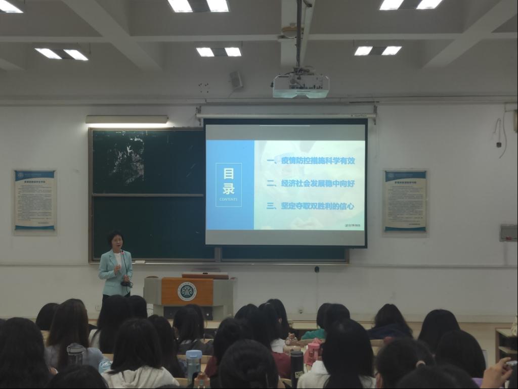 吴春艳书记以“高效统筹疫情防控和经济社会发展”为主题,从“疫情防控措施科学有效”、“经济社会发展稳中向好”、“坚定夺取双胜利的信心”三个方面为学生作了详细讲解。她结合自身参与疫情防控的亲身经历,用翔实的数据,生动的案例、身边感人的故事,深刻阐释了我国疫情防控政策为何是科学有效和可持续,指出“躺平”不可取,“躺赢”不可能。面对新冠肺炎疫情给世界各国带来的冲击与挑战,她谈到我国经济社会发展稳中向好的形势。面对疫情防控和经济社会发展新局势新问题,她指出,我们要坚定夺取双胜利的信心。她还就同学们关心的就业问题,介绍了学院22届毕业生高质量就业情况及国家和当地政府帮助毕业生就业的各项举措。最后,她强调,我院师生在学院党委的领导下,统筹疫情防控,众志成城,希望同学们珍惜疫情下来之不易的时光,合理规划学习时间,严格遵守疫情防控安排,学会自我管理、自我学习、自我进步,在攻坚克难中成熟成长。