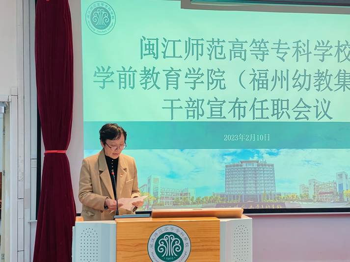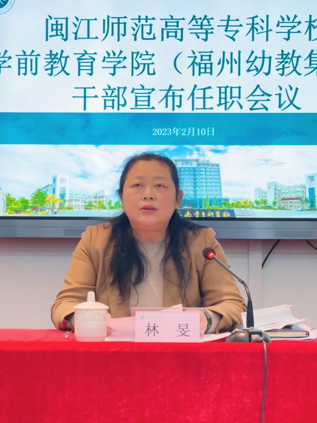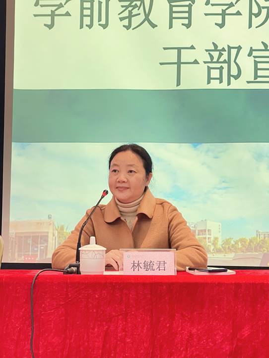 接着,林毓君院长对四位履新干部同志表示衷心的祝贺。同时,她回顾了学前教育学院(福州幼教集团)专业建设十二载以来取得的成绩,也希望在新的党委班子的领导下,全体教职工能凝心聚力,再创佳绩。