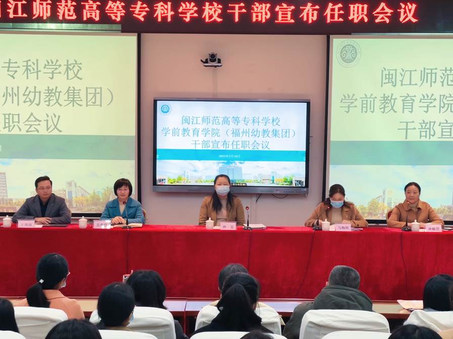 2月10日下午,学前教育学院于旗山校区2018教室召开新任职干部宣布任职大会,宣布学前教育学院主要干部职务调整的决定。校党委副书记林旻、校党委组织部部长马梅铃、新任职干部、学前教育学院(福州幼教集团)全体教职工参加会议。会议由林毓君院长主持。