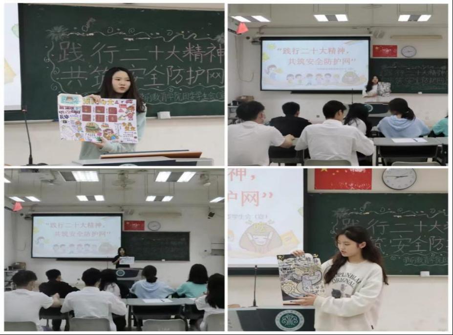 为全面贯彻落实党的二十大精神,做好安全宣传工作,提高学院学子的安全防范意识,2023年3月23日,学前教育学院于旗山校区教学楼1002教室开展了以“践行党的二十大精神,共筑安全防护网”为主题的作品评选活动。