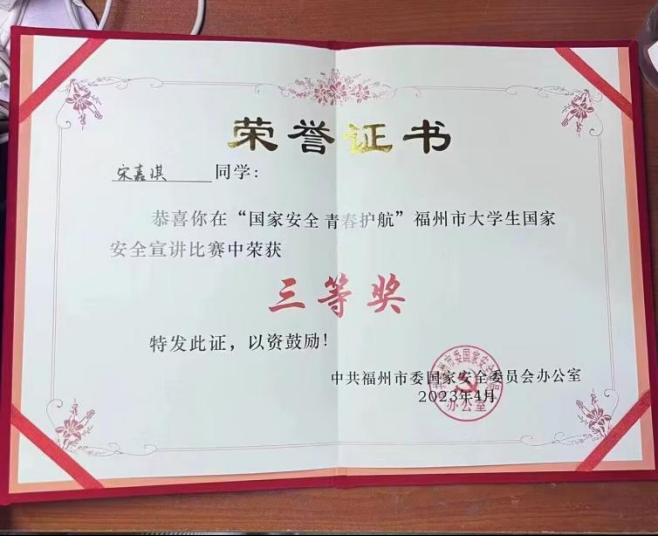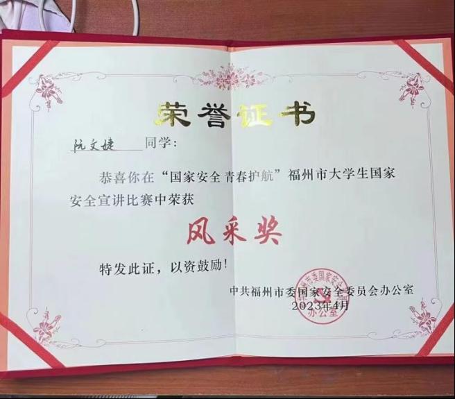 4月11日下午,由市委国安办、市委保密办、福州市国家安全人民防线建设领导小组办公室、市教育局主办的主题为“国家安全,青春护航”福州市大学生国家安全宣讲比赛在福州职业技术学院顺利举行,我院两名学子宋嘉琪、阮文婕分别斩获三等奖和风采奖。