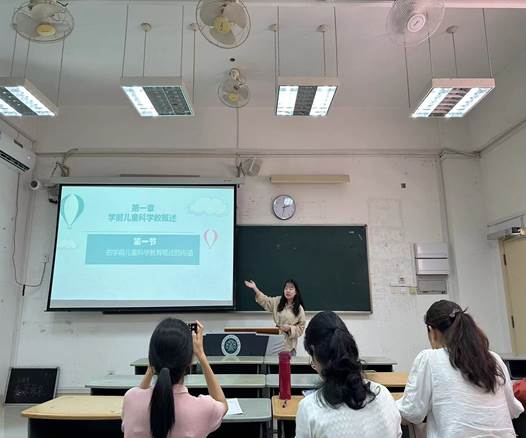 王丹丹、白慧、胡慧娟、林萃老师分别给参训教师开了《幼儿园班级管理》、《学前教育学》、《学前儿童科学教育》、《儿歌弹唱》四门课程的公开课,从教学设计、实施、评价等方面提升学员的教育教学能力;王晶老师给学员开设了《托幼机构安全规范化管理策略》和《幼儿园游戏课程化实施路径》两场讲座,通过大量幼儿园一线案例,理论联系实际,向参训学员介绍了幼儿园管理及课程建设等方面内容;此外还应学员需求,旁听了李艳花老师《幼儿园健康教育》和许琮皓老师《学前教育史》两门课,感受分组教学和信息化手段在课堂上的运用。
