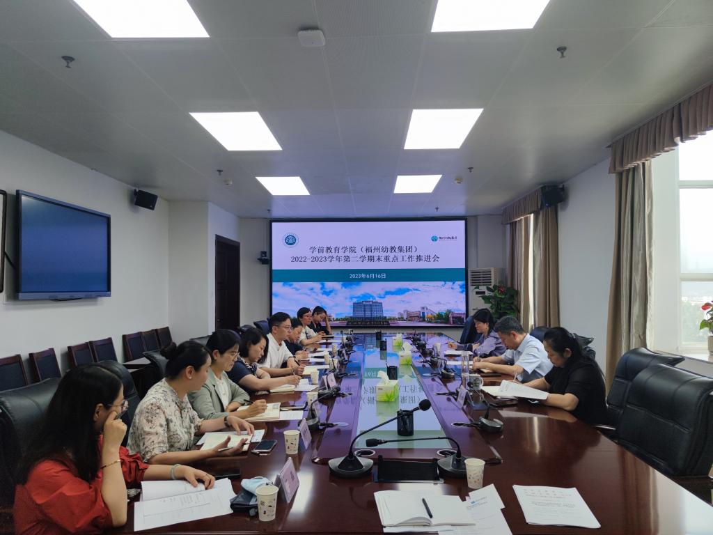 6月16日上午,学前教育学院(福州幼教集团)在旗山校区召开2022-2023学年第二学期末重点工作推进会,校领导陈荣生书记、林旻副书记、教务处葛思华处长,以及学院领导班子、综合科、各幼儿园园长等参加会议。