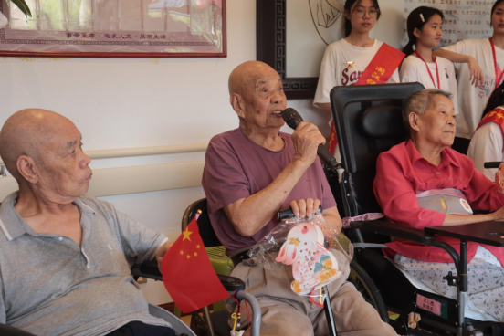 在全场齐声高唱《歌唱祖国》后,两位年过九旬的退伍老战士,为大家讲述了自己抗战的经历,从参军入伍讲到亲身经历的战场,从艰苦的战争环境讲到顽强拼搏的斗争精神,传递了舍家卫国、矢志不移的爱国情怀,为大家上了一堂生动的爱国主义党课。