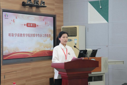 丘苏兰代表学前教育学院学生会作工作报告。报告从加强思想政治引领,打造特色品牌活动,搭建网络新媒体矩阵,深化组织体系改革,四个方面回顾了学前教育团委学生会过去的工作,并表示学前教育学院团委学生会将认真学习贯彻习近平新时代中国特色社会主义思想和党的二十大精神,积极开展各项工作,为学生的全面发展和校园文化建设做出更大奉献。