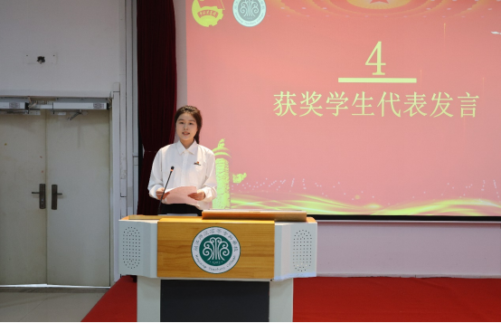 林嫣同学作为获奖学生代表发言。她分享了自己在学习和成长过程中的体会与感悟,表示将做好广大青年的榜样,加强政治锻造,积极向党组织靠拢,努力成为社会主义事业的合格建设者和可靠接班人,在中国式现代化建设的新征程上挺膺担当。