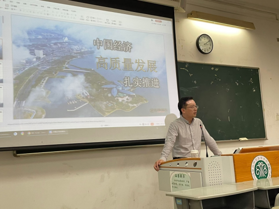 王海波副书记从“回升向好韧性强”、“全面长远辩证看”、“多措并举提质量”三个层面展开授课,全面剖析了中国经济的发展态势、面临的复杂环境和挑战以及具备的优势条件。王海波指出,虽然全球经济形势复杂多变,但中国经济依然保持着稳健的增长态势,展现了其强大的韧性和内生动力,这得益于中国政府的有效调控和广大市场主体的共同努力。同时,他也提醒同学们要全面长远辩证地看待中国经济的发展,既要看到当前取得的成就,也要正视存在的问题和挑战,使同学们对中国经济的发展与挑战有了更为深刻的认知与感悟,进一步明确了自己专业技能和就业发展的方向。