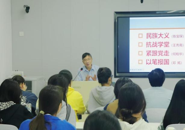 讲座中,姚翔老师以“烽火抗战,教育救国”为主线、以党史校史为脉络,串联四位英贤故事,诠释闽师专精神。全闽师范学堂创办先驱陈宝琛,以“教育救国”定校歌、立初心,拉开“立教八闽”育人序幕;抗战时期,校长王秀南怀“愿将铁血夷倭寇”壮志,提“笔杆研学、枪杆卫国、锄头杆生产”的“三杆教育”,率师生办民校、宣救亡、垦荒自养,守牢烽火中的教育阵地,诠释“涵育四海”精神;作为南昌起义福州唯一女性党员,何柏华扎根闽师讲台,以校训传红色火种,让“跟党走、育新人”的初心落地;校友邓拓以“厚德载物”为准则,以笔为枪办报刊、醒民众,成“文以救国”标杆。