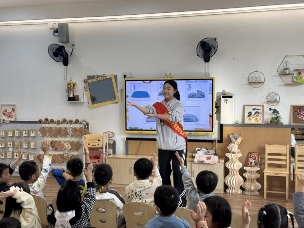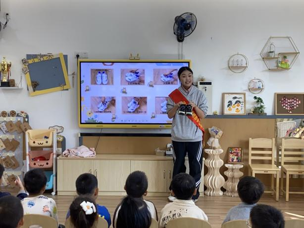 活动伊始,入党积极分子们携带精心准备的绘本走进班级,以生动活泼的语气、惟妙惟肖的动作演绎《小熊的一天》,将劳动场景融入趣味故事,让抽象的劳动意义变得具体可感。讲述过程中不时与幼儿互动问答,在轻松有趣的一问一答间,引导幼儿直观感受到劳动的快乐。随后,入党积极分子们分组开展实践指导,手把手教幼儿学习穿鞋、叠被等生活技能。结合幼儿的认知特点,她们提前拆解细化操作要领,用童趣化语言讲解示范,如“鞋子脚尖对脚尖,就像好朋友面对面打招呼”、“被子先铺开,把长边角对齐碰一碰,再轻轻对折就整齐啦”。每当有孩子顺利完成操作,大家便及时送上热烈掌声与暖心鼓励,让幼儿们在亲手实践中收获满满的成就感与自信心。紧接着,现场气氛在欢快的歌声中推向高潮,入党积极分子们带领幼儿拍手传唱《劳动最光荣》,轻快节奏与易懂歌词让劳动理念随旋律悄然传递。此外大家还精心设计趣味动作,如抬手模仿阳光洒落,引导幼儿幼儿模拟“自己梳妆”等场景,孩子们载歌载舞间,既深化了对“劳动”的认知,小脸上更绽放出灿烂的笑容。
