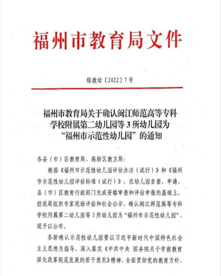近日,闽江师范高等专科学校附属第二幼儿园被评为“福州市示范性幼儿园”。
