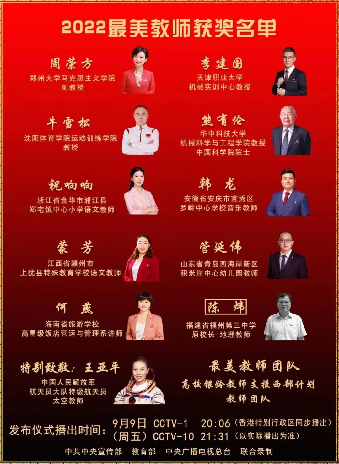 熊有伦、牛雪松、周荣方、李建国、何燕、蒙芳、陈炜、韩龙、祝响响、管延伟等个人和高校银龄教师支援西部计划教师团队,都是来自教育一线的教师和群体。他们中既有坚守在边远艰苦地区的乡村教师和支教教师代表,又有职业教育中达到国家技能大师水平的“双师型”教师典型;既有优秀退役军人到欠发达地区担任乡村教师代表,又有在体育教育领域默默奉献培育为国争光运动员的教师典型;既有深受大学生喜爱的思政课教师代表,也有致力于核心技术自主创新的高精尖教师典型……他们涵盖了高教、职教、基教、幼教、特教等各级各类教育,师德表现和教书育人实绩突出、事迹感人,具有广泛的代表性和示范性,充分展示了教师队伍有理想信念、有道德情操、有扎实学识、有仁爱之心的良好精神风貌。