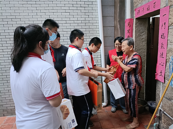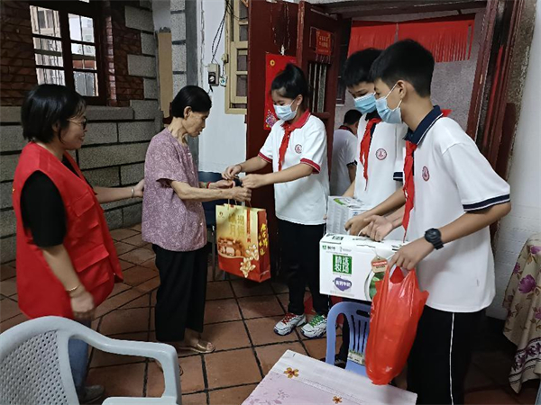 泉州培元中学组织初一年段少先队员开展中秋慰问活动。每到一户,学校党员教师、少先队员与困难群众都会“拉家常”,详细了解他们的家庭状况、身体情况及生活中存在的困难和问题。志愿者们将月饼、饼干等爱心慰问品送到困难户的手中,并祝愿他们度过一个祥和温馨的中秋佳节。
