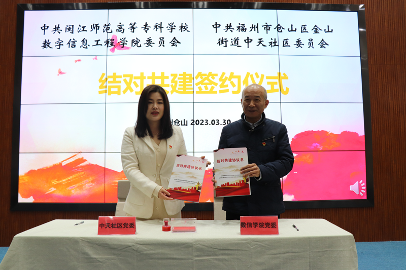 为贯彻落实党的二十大精神,深化党建引领加强基层治理体系和治理能力现代化建设,推动高校与街道(乡镇)、社区(村)、网格的党组织联建共建,推进场所设施共用、力量资源共享,丰富党员教育管理载体和形式。3月30日上午,数字信息工程学院党委与仓山区金山街道中天社区党委举行共建签约仪式,正式建立结对共建关系。数字信息工程学院党委陈欣书记、董秋锋副书记,中天社区党委陈卉书记及双方所属党支部书记出席签约仪式,中天社区领秀苑支书记甘晓丽主持仪式。