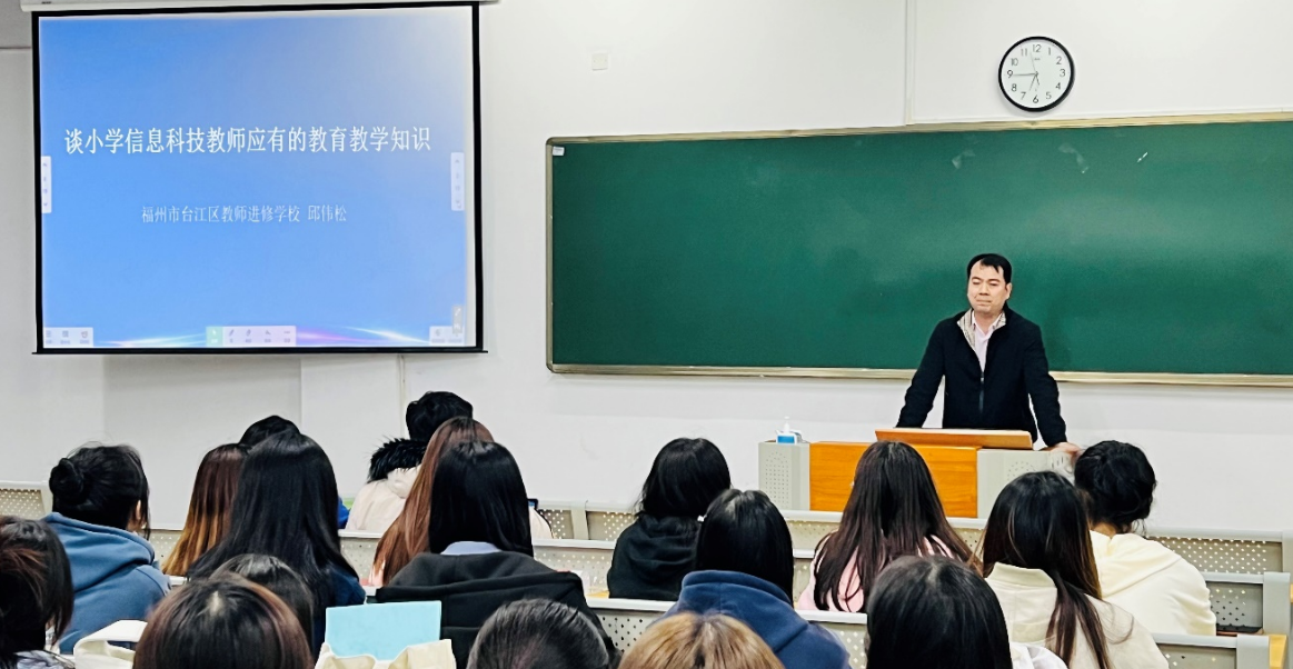 为提升数字信息工程学院现代教育技术专业办学质量,让学生明确职业发展规划,4月6日晚,我院邀请福州市台江教师进修学校邱伟松老师在仓山校区2#406作题为“谈小学信息科技教师应有的教育教学知识”的专题讲座。现代教育技术专业全体学生参加本次讲座,讲座由现代教育技术教研室主任王凤姣主持。