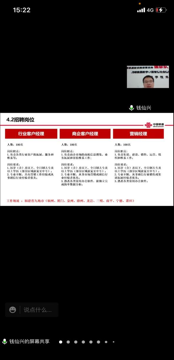 为做好离校未就业毕业生服务工作,满足毕业生的就业需求,促进毕业生尽快就业,我院于7月11日下午邀请了福建省联通钱仙兴主管进行招聘宣讲,本次招聘会采用线上腾讯会议形式,20级未就业学生、21级部分学生参加,李晶晶老师主持了本次会议。