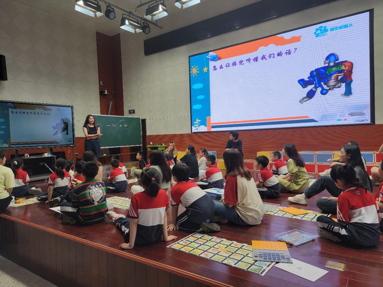 课堂上,现代教育技术专业学生充当学生们的信息技术小老师,介绍裤兜机器人编程如何使用,以及能实现的功能。通过项目化教学,让孩子们了解到什么是编程,编程可以实现什么,提高孩子们的编程意识,并通过自己的双手实现自己的创意、自己的想法,做出有用或者好玩的东西,带领孩子们感受编程乐趣,领略编程魅力。