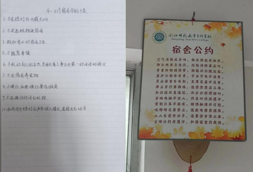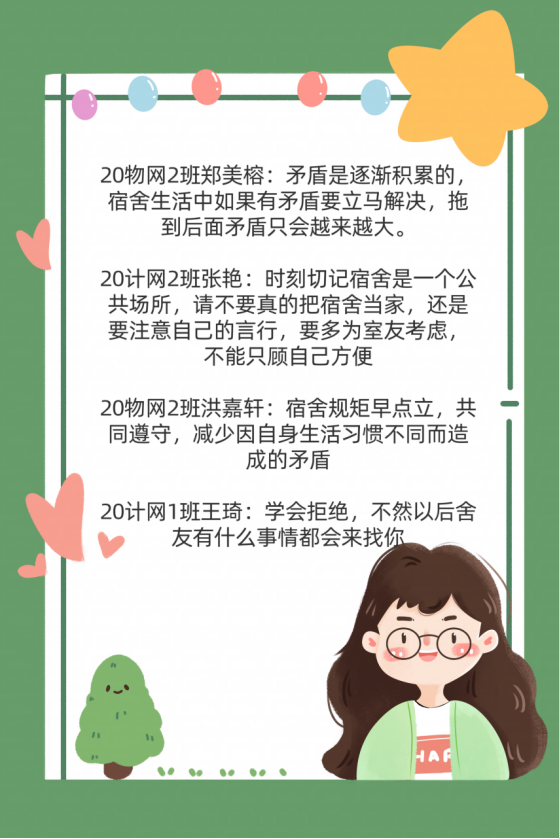 本次活动旨在倡导同学们要有一颗包容的心,接纳彼此的不足和缺点,感恩彼此的爱和陪伴。首先发动21级、22级各宿舍开展了“真心话大冒险”趣味小游戏,引导宿舍成员说出对宿舍的真实评价和意见以及宿舍成员的优缺点。接下来在宿舍成员的共同探讨下,制定一份舍规,并粘贴在宿舍明显的地方。最后发动20级的学长学姐给学弟学妹们在宿舍相处方面提出一些小建议。本次活动共收到了20多条建议,总结起来有三点。第一点是要学会沟通,及时化解矛盾;第二是要尊重别人的习惯,积极主动关心别人;第三是制定宿舍规则,自觉遵守宿舍规定。