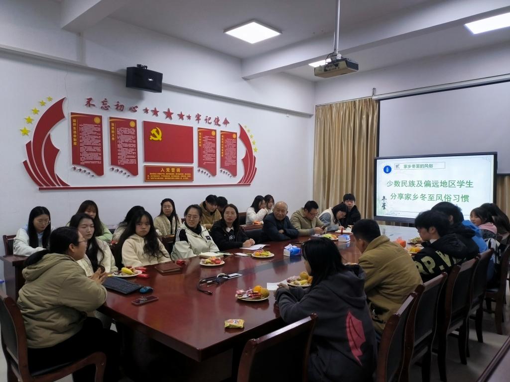交流会上,李晶晶老师介绍了冬至的知识和各地一般习俗。随后,与会的师生踊跃分享各地的独特习俗,包饺子、搓汤圆、祭祖祈福等等,展现各地区各民族不一样的文化魅力,促进文化交流。陈欣书记举例冬至习俗鼓励同学们要了解中华优秀文化,传承和弘扬优良传统,守住优秀文化的根。