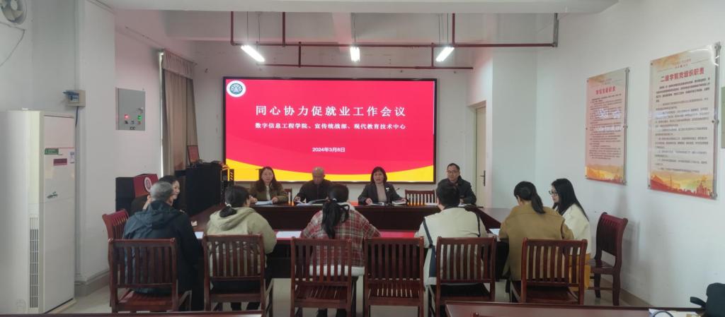 3月8日上午,数字信息工程学院与校党委宣传统战部、现代教育技术中心联合召开同心协力促就业工作会议,研究部署学院、部门共同促进毕业生就业工作。数字信息工程学院领导班子及毕业班辅导员,宣传统战部部长张信容及部门成员,现代教育技术中心主任李闽及部门成员参加会议。