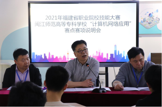 3月27日,2021年福建省职业院校技能大赛计算机网络应用赛项说明会在我系2#305室召开。省职业技术教育中心教研部主任、赛项指导游金水,系主任、赛事保障工作组组长李瑞兴,赛项监督员、裁判长、组织保障各工作组组长以及各参赛队领队、指导老师共同参加了本次说明会。会议由系副主任王华主持。
