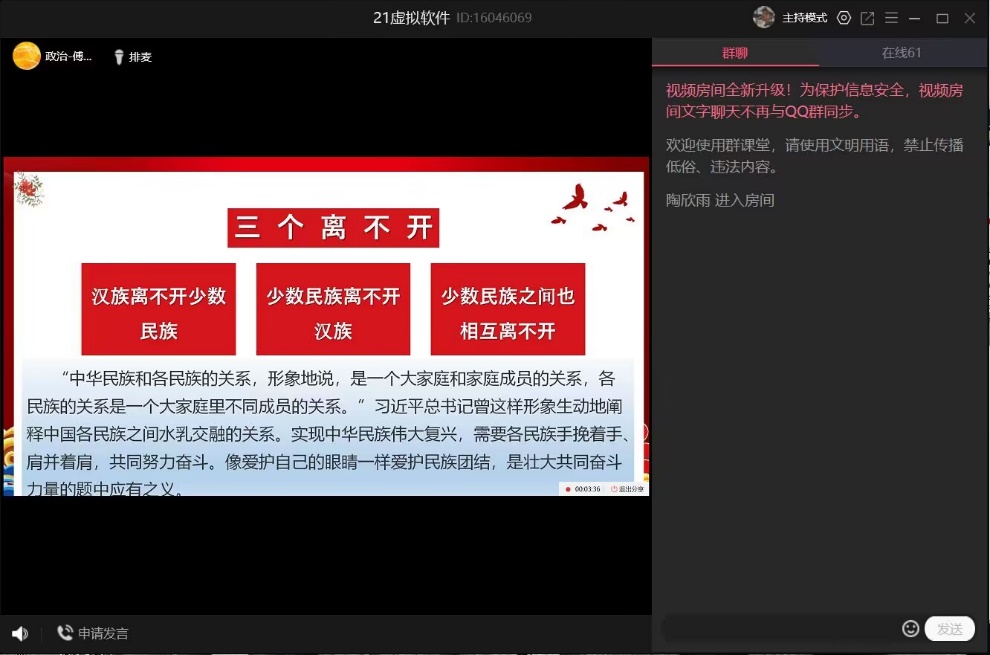 近日,为加强学生对我国民族政策的理解,铸牢中华民族共同体意识,数字信息工程学院全体辅导员以线上线下形式开展“民族大团结,共筑中国梦”民族团结教育专题思政课,全院1700多名学生参与活动。