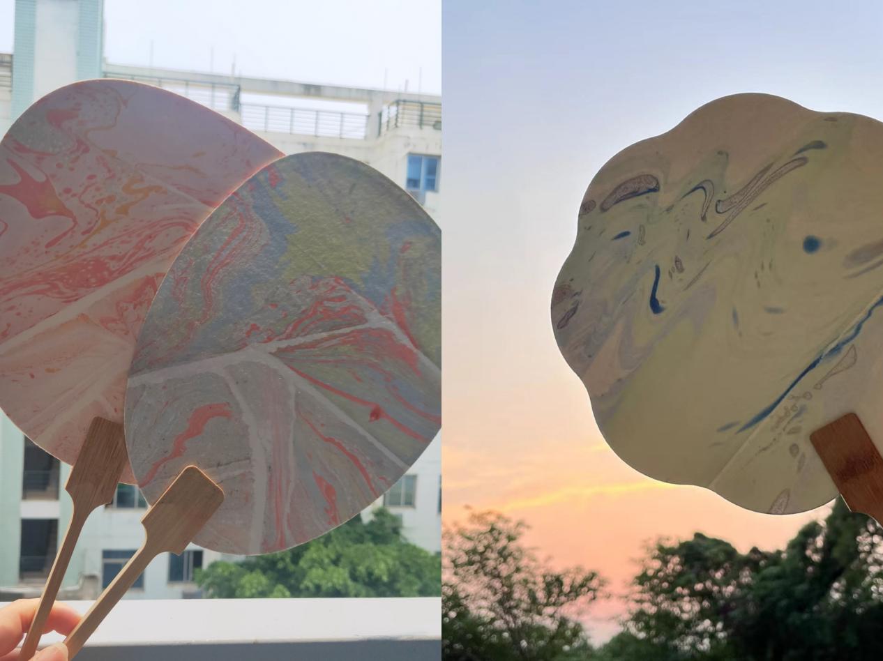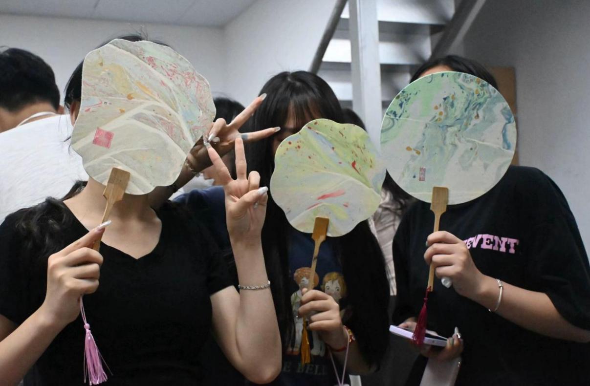 参与的师生首先学习调漆料、绘图案、抹漆面等步骤,掌握漆扇的相关知识。随后,大家在工作人员的指导下将自己喜欢的颜料滴入水中,用搅拌棒在水面绘出图案,将扇子缓缓放入水中,使图案附着于扇子上。最终,大家绘就了一幅幅精美图案,使扇子更加鲜活生动,令人赞叹不已。师生们动手实践,感受传统工艺的魅力,活动热烈而有趣。