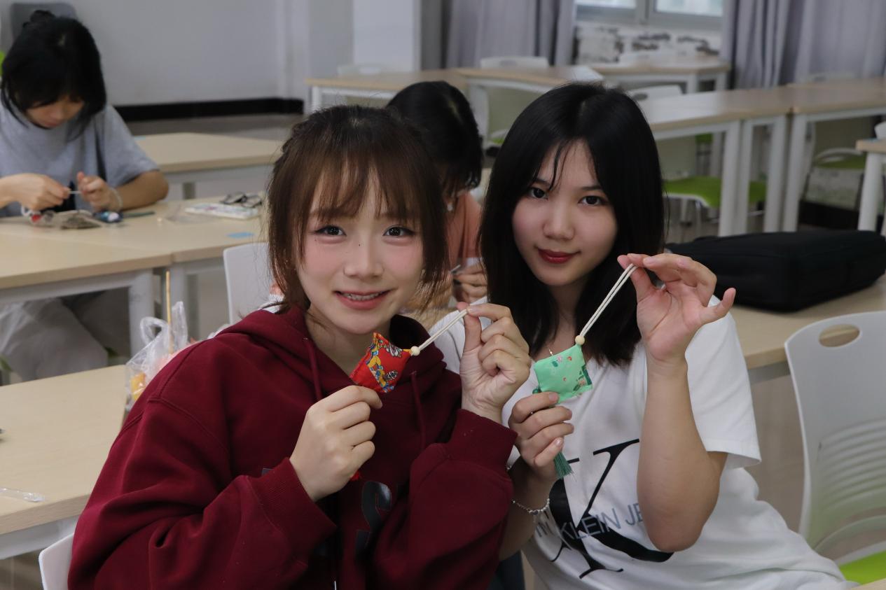 活动前期,工作人员精心挑选彩绳、针线、挂饰等材料,并整理贴心教程。活动中,工作人员首先普及了端午由来及习俗。随后,引导大家各自挑选心仪配饰,介绍制作步骤。同学们一丝不苟地完成穿五彩线、缝合香囊、填充香料、收口、装饰流苏等步骤,将诚挚的端午祝福倾注在一针一线中。