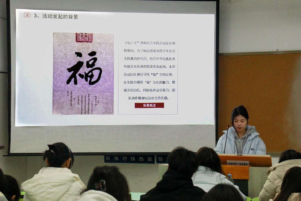 活动中,各实践团队借助PPT 演讲、视频展示等形式,分享了在寒假实践中的经历与收获。内容丰富多样,涉及 “非遗”传承的探索、福文化的传承和体验、返家乡的岗位实践等多个方面。同学们深入社会,将理论与实践结合,展现出青春担当。
