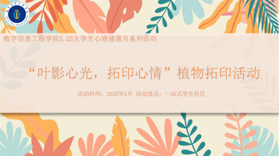 2025年5月,数字信息工程学院在仓山校区“一站式”学生社区举办“叶影心光,拓印心情”植物拓印活动。本次活动以植物拓染为载体,通过自然疗愈与手工创作相结合的形式,吸引了我院众多学生参与,在拓印留存叶片脉络、花朵轮廓的过程中疏解压力,感受自然与艺术的融合之美。