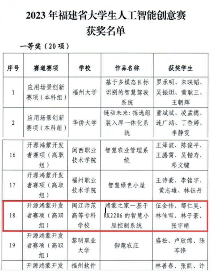 在2023年福建省大学生人工智能创意赛中,由物联网技术教研室朱发财、管定铕两位老师指导的作品《鸿蒙之家-基于RK2206的智慧小屋控制系统》获得开源鸿蒙开发者赛项(高职组)一等奖;由大数据技术教研室李彬雅、李翔宇两位老师指导的作品《智慧财务小助手TaskAI》获得应用场景创新赛项(高职组)三等奖;由现代教育技术教研室王凤姣、谢金池两位老师指导的作品《智安车》获得应用场景创新赛项(高职组)三等奖。