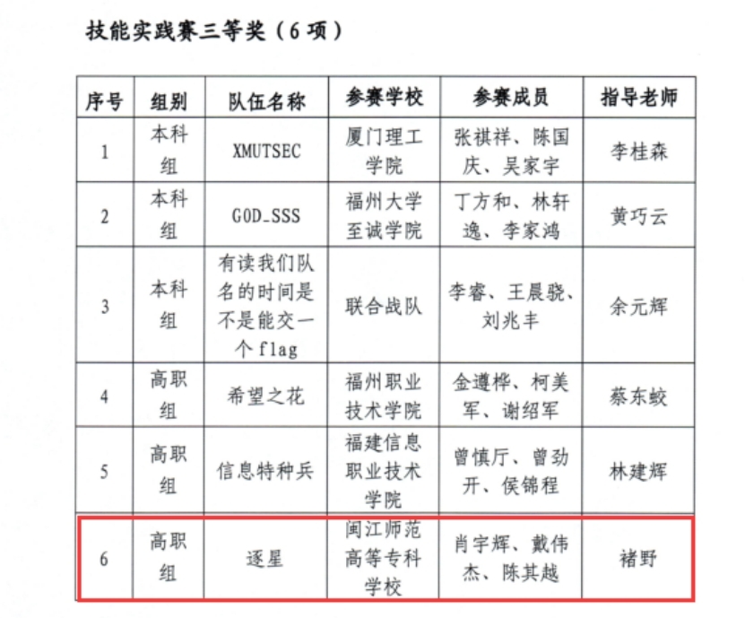 在2023年福建省大学生数据安全大赛中,我院21级信息安全技术应用专业学生曾涵辉与其他高校学生组成的联合战队获得技能实践赛(高职组)二等奖,由信息安全技术教研室褚野老师指导的逐星队获得技能实践赛(高职组)三等奖。