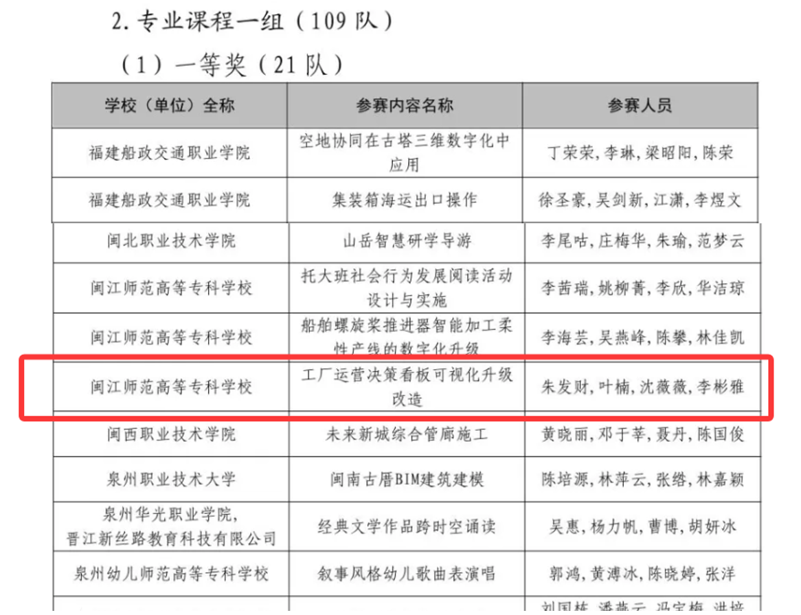 近期,福建省教育厅公布了2025年福建省职业院校技能大赛教学能力比赛的拟获奖名单。我院朱发财、叶楠、沈薇薇、李彬雅四位教师团队的作品《工厂运营决策看板可视化升级改造》,于激烈的竞争中崭露头角,成功荣获高职专业课程一组一等奖。
