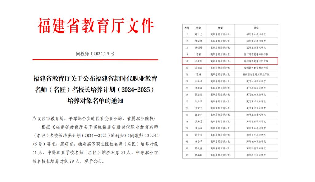 近日,福建省教育厅公布了福建省新时代职业教育名师(名匠)名校长培养计划(2024-2025)培养对象名单,数字信息工程学院党委副书记、院长朱发财同志入选福建省高职名师培养对象。