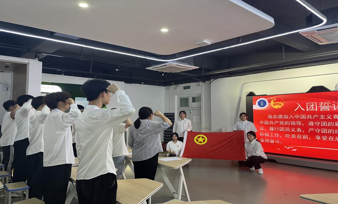 宣誓环节,在场全体团员跟随李晶晶老师,目光坚定地面向团旗,慷慨激昂地许下庄严的誓词。