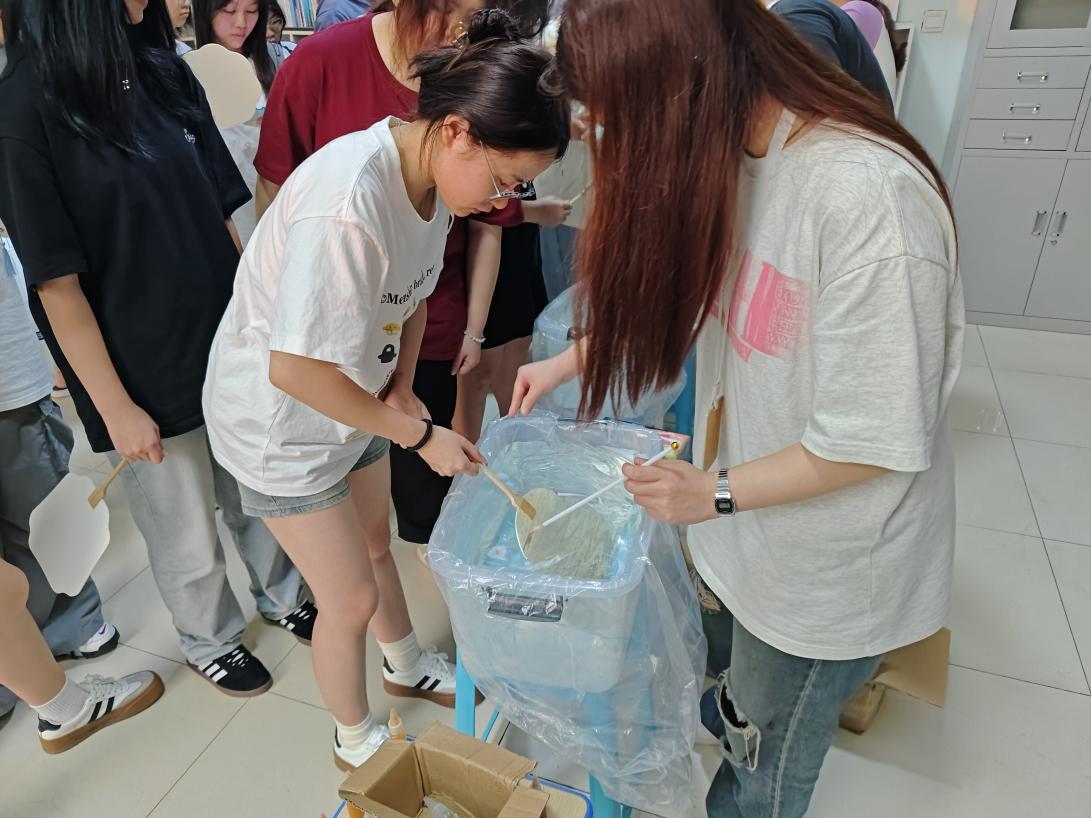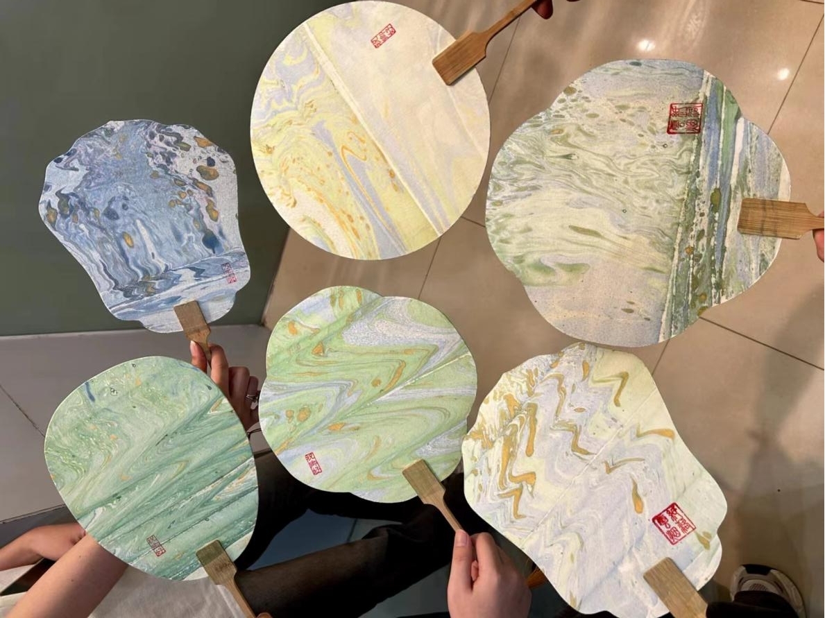 参与的师生首先学习调漆料、绘图案、抹漆面等步骤,掌握漆扇的相关知识。随后,大家在工作人员的指导下将自己喜欢的颜料滴入水中,用搅拌棒在水面绘出图案,将扇子缓缓放入水中,使图案附着于扇子上。最终,大家绘就了一幅幅精美图案,使扇子更加鲜活生动,令人赞叹不已。师生们动手实践,感受传统工艺的魅力,活动热烈而有趣。