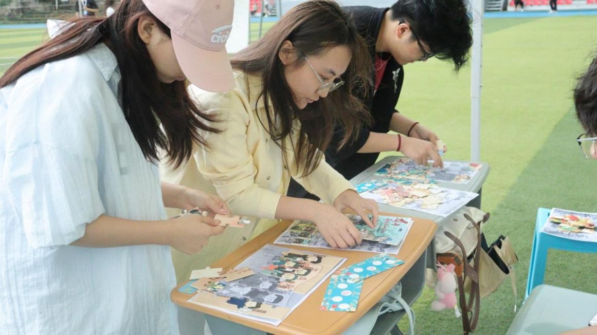 活动现场热烈,我院学子在每个小游戏摊位前排起长队。第一个游戏为“口号传声筒”,参与的同学们通过传声筒接力传诵“外争主权,内除国贼”等经典口号;第二个游戏为“觉醒者拼图挑战”,同学们在规定时间内复原《新青年》创刊号封面拼图;第三个小游戏为“科学真理投掷赛”,同学们从“科学真理箱”中找出代表旧社会的“糟粕”的卡片并将其投掷出去;第四个游戏名为“薪火拼贴”,同学们通过组合“民主”“科学”“爱国”等关键词卡片生成标语;最后一个游戏为“五四画布重现”,经过重重关卡,同学们在最后的画布上留下五四运动名言或画上关于五四运动的图案,以此表达对五四运动的歌颂。