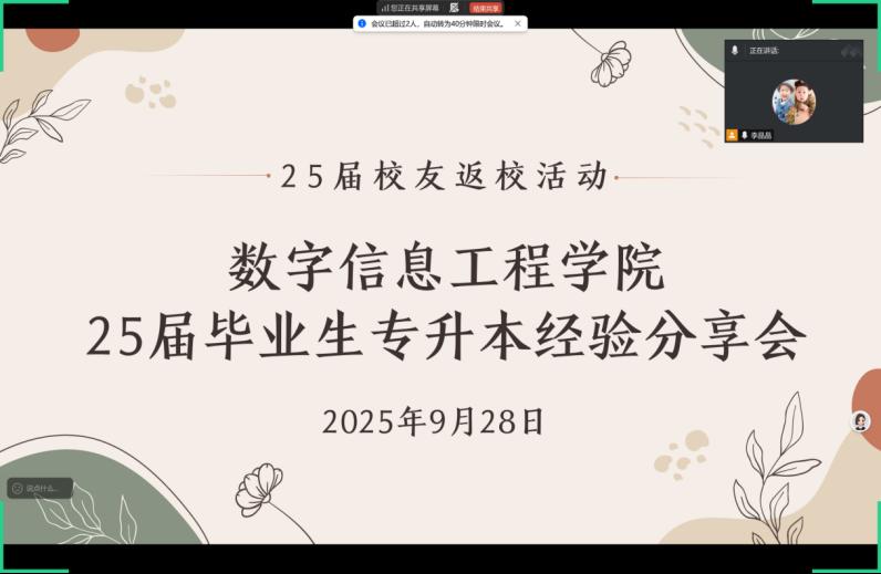 2025年9月29日,数字信息工程学院以“校友返校·经验传帮带”为主题,举办了线上校友返校分享活动。此次活动特别邀请了2025届毕业生校友吴龙飞,为学院2026届毕业生带来了一场专升本经验分享会,旨在帮助学生明确备考方向、规划学习路径。本次活动由学院团委指导老师李晶晶主持,2026届毕业生员参与。