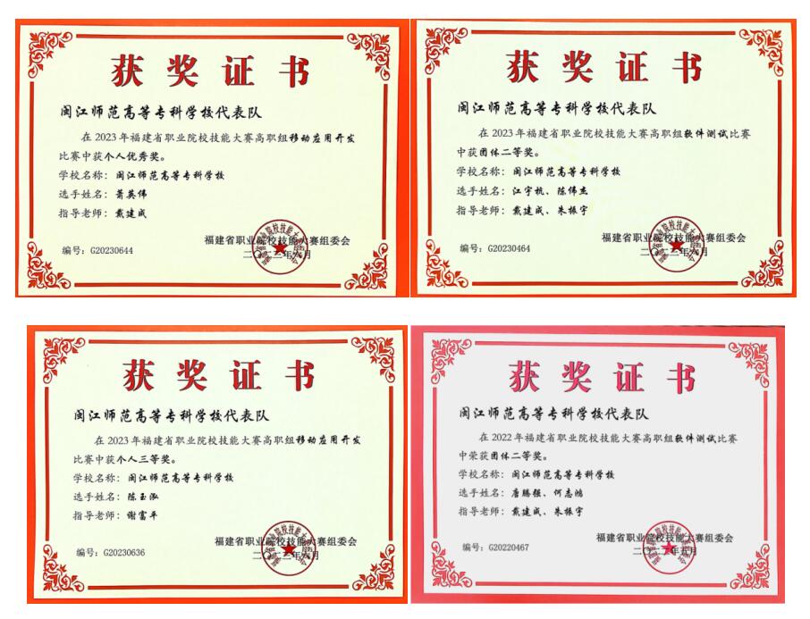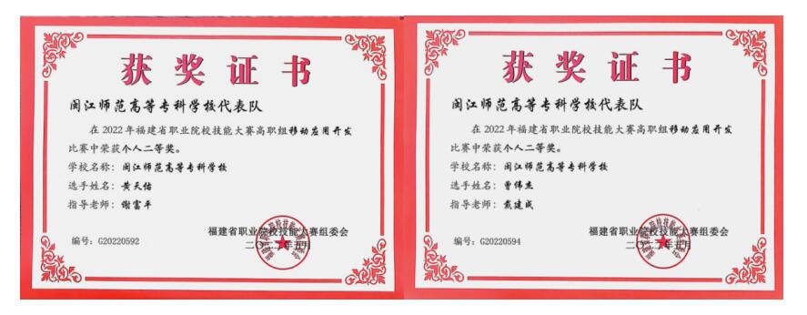 2022年荣获福建省职业院校技能大赛“移动应用开发”赛项二等奖2项;