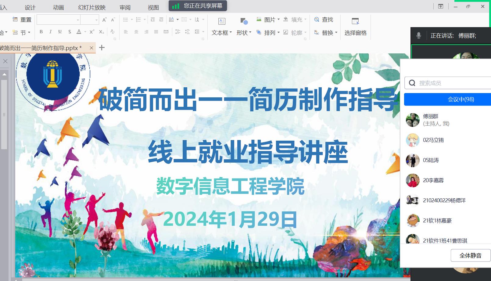 寒假不断线,暖心促就业。1月29日晚,数字信息工程学院开展“就业赋能——简历制作指导”线上专题讲座,毕业班辅导员担任主讲,2024届毕业生参加。