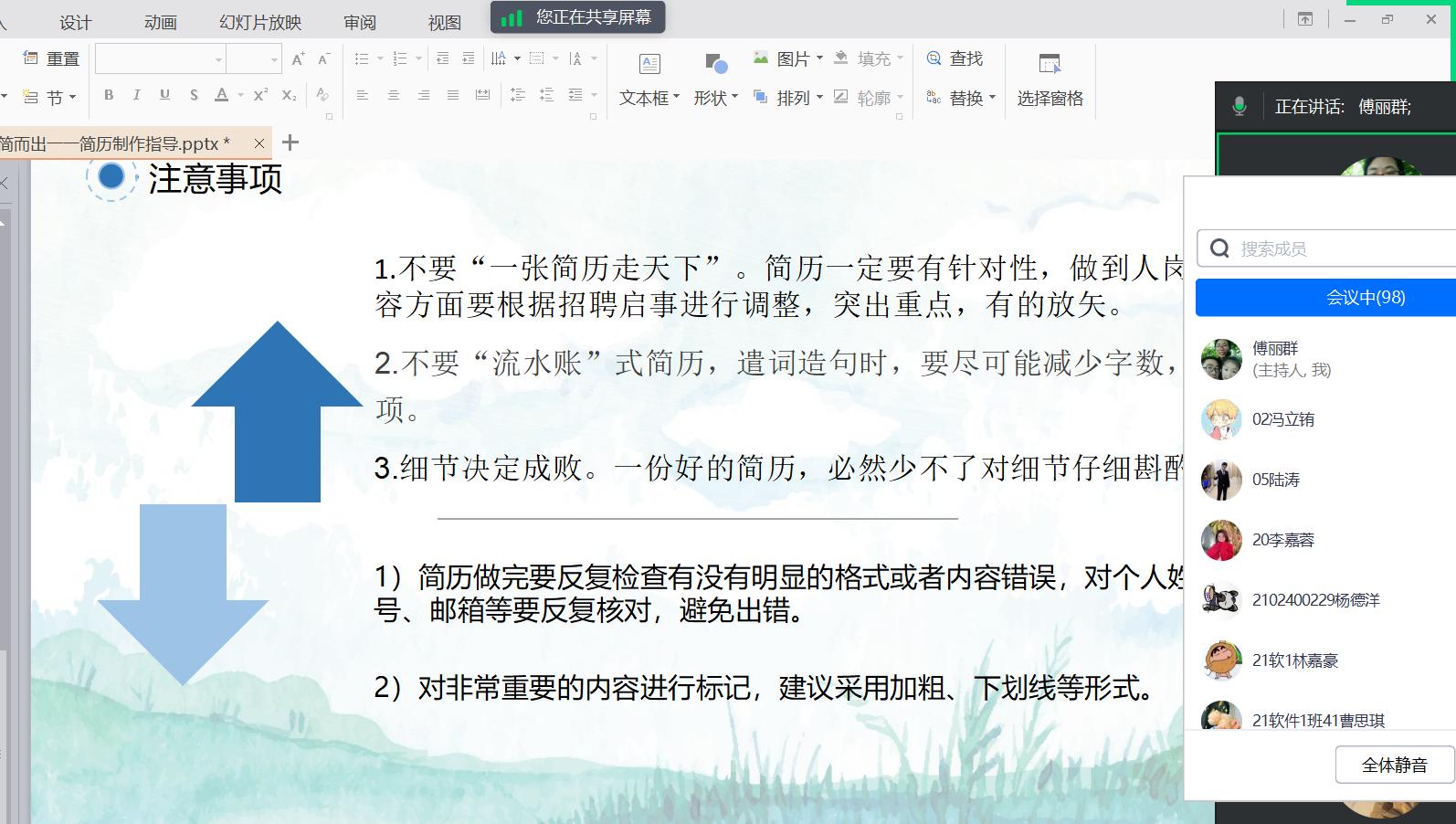 讲座中,辅导员老师从简历的结构、主要内容、注意事项以及投递方法四个方面为同学们进行介绍。重点讲解了照片、基本信息、教育经历、实践经历、技能证书、奖励荣誉等简历组成部分的填写注意事项,同时通过实际例子进行示范讲解,指出简历制作中常见的误区,引导督促同学们认真对待个人简历制作,为求职做好充分准备。