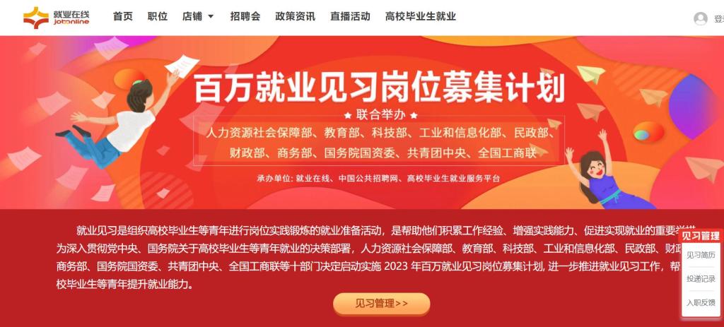 百万就业见习岗位募集计划平台,网址:https://www.jobonline.cn/probation/index